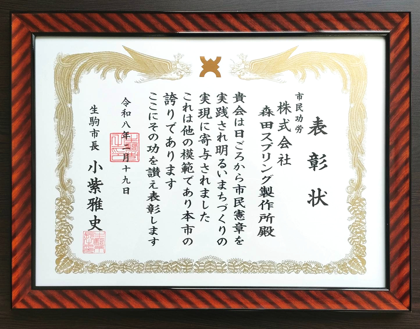 お知らせ2026年2月19日生駒市より 市民憲章実施功労者として表彰されました